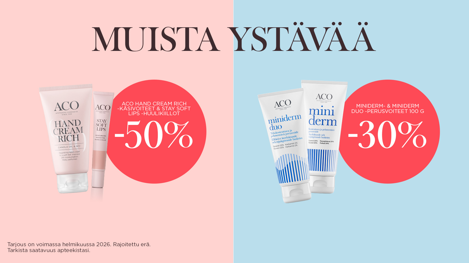 heart Ale Heti saatavilla ACO Body Protecting Cream Protect 200 ml Kampanjahinta 9,10 € Normaali hinta 11,40 € Ale 20.18%