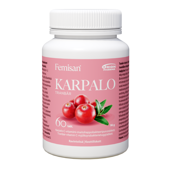 500mg/tabletti Karpalojauhe 40mg/tabletti C-Vitamiini Probiootti: Lactobacillus acidophilus Lactiplantibacillus plantarum Lacticaseibacillus rhamnosus