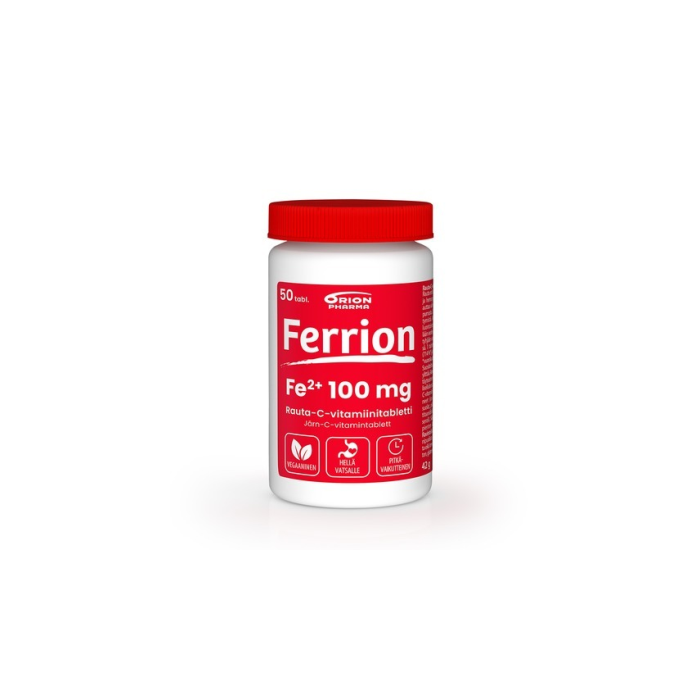 Ferrion 100 mg on vahva, pitkävaikutteinen rauta -ja C-vitamiinivalmiste, jossa rauta on vatsaystävällisessä bisglysinaattimuodossa. Ferrion sisältää 100mg rautaa ja 60 mg raudan imeytymistä tehostavaa C-vitamiinia. Pitkävaikutteisesta tabletista rauta vapautuu vasta ohutsuolessa, mistä se parhaiten imeytyy elimistön käyttöön. Valmisteen voi halutessaan nauttia myös ruokailun yhteydessä*, mikä voi auttaa vähentämään mahdollista vatsaärsytystä. Pienikokoisen, helposti nieltävän tabletin voi tarvittaessa puolittaa. Sopii myös vegaaneille. Ravintolisä.