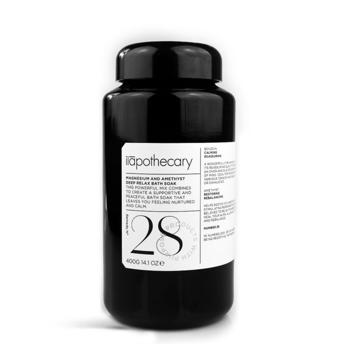 ilapothecary Magnesium & Amethyst Deep Relax Bath Soak sisältää niin ihoa hoitavia ja hemmottelevia kuin kehoa tehokkaasti rentouttavia ainesosia. Magnesium on tehokas, lihaksia rasituksesta palauttava apulainen paljon liikkuvalle, urheilijalle, seisomatyöläiselle sekä iän alkaessa painaa jaloissa. Ametisti tunnetaan kuona-aineiden poistumista kehosta tehostavasta voimastaan ja bentsoe kehon rentoutumista edistävästä vaikutuksestaan. Nukahtamista ja levollisia yöunia kylpysuolassa tukevat setripuun ja vetiverin eteeriset öljyt.