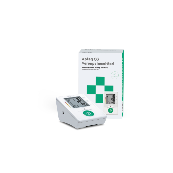 Apteq Q3 on laadukas, tarkka ja luotettava automaattinen olkavarsiverenpainemittari perustoiminnoilla koko perheen käyttöön. Real Fuzzy teknologia mahdollistaa tarkemmat tulokset ilman epämukavaa puristusta. Ilmoittaa mittauksen yhteydessä epäsäännöllisestä sykkeestä ja mittausta häirinneistä kehon liikkeistä. Näyttää verenpainetaudin riskiasteen. Apteq Q3 on kliinisesti validoitu, eli sen tarkkuus on varmistettu puolueettomissa kliinisissä tutkimuksissa. Verenpaineen mittaus on erittäin helppoa ja onnistuu yhdellä napin painalluksella. Tarvittaessa saat haettua edellisten 90 mittauksen tulokset verenpainemittarin muistista.